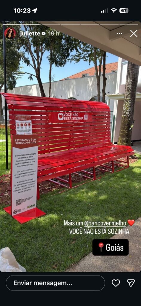 A ação logo gerou curiosidade entre as pessoas que passam pelo Setor Vila Nova, em Goiânia, e ganhou maior repercussão quando a ex-BBB, hoje cantora e influencer, Juliette postou em suas redes sociais a foto, elogiando a ação realizada na sede da Seduc-Goiás: “Mais um banco vermelho, você não está sozinha”, escreveu ela.